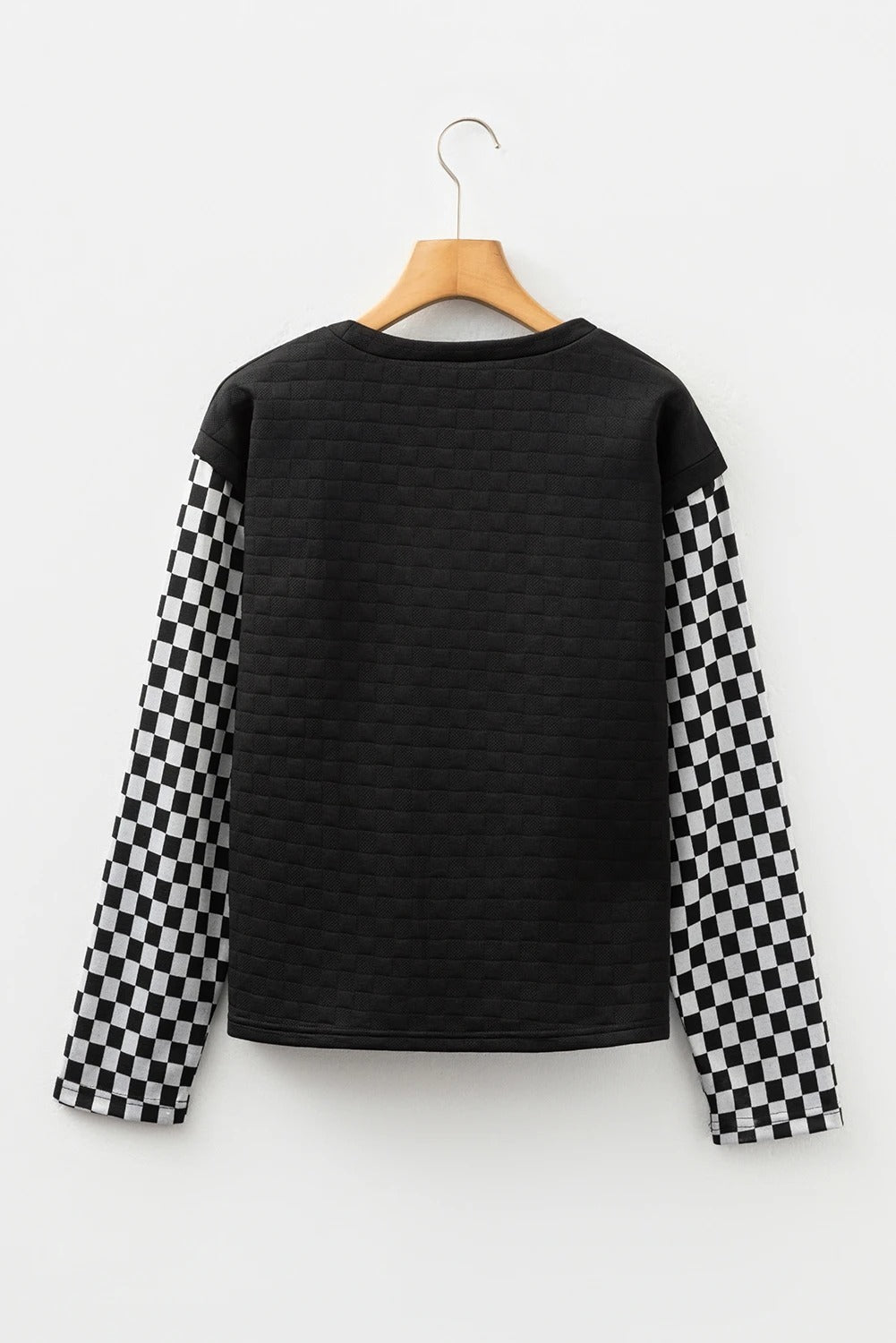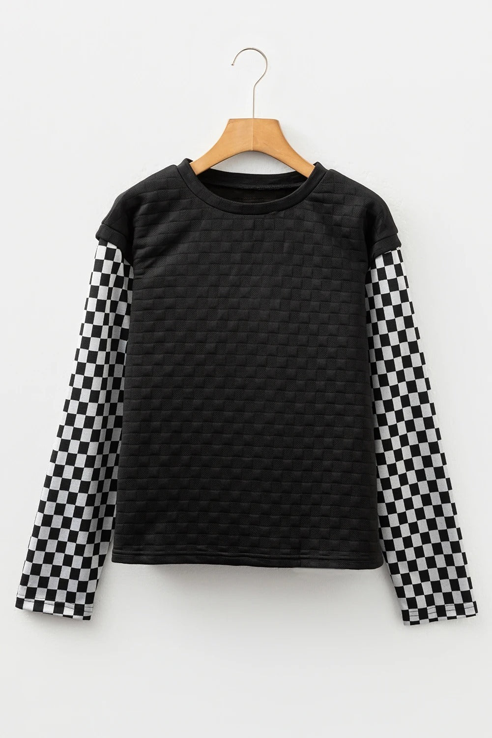 Black Plaid Textured Contrast Checkered Patchwork Long Sleeve Top